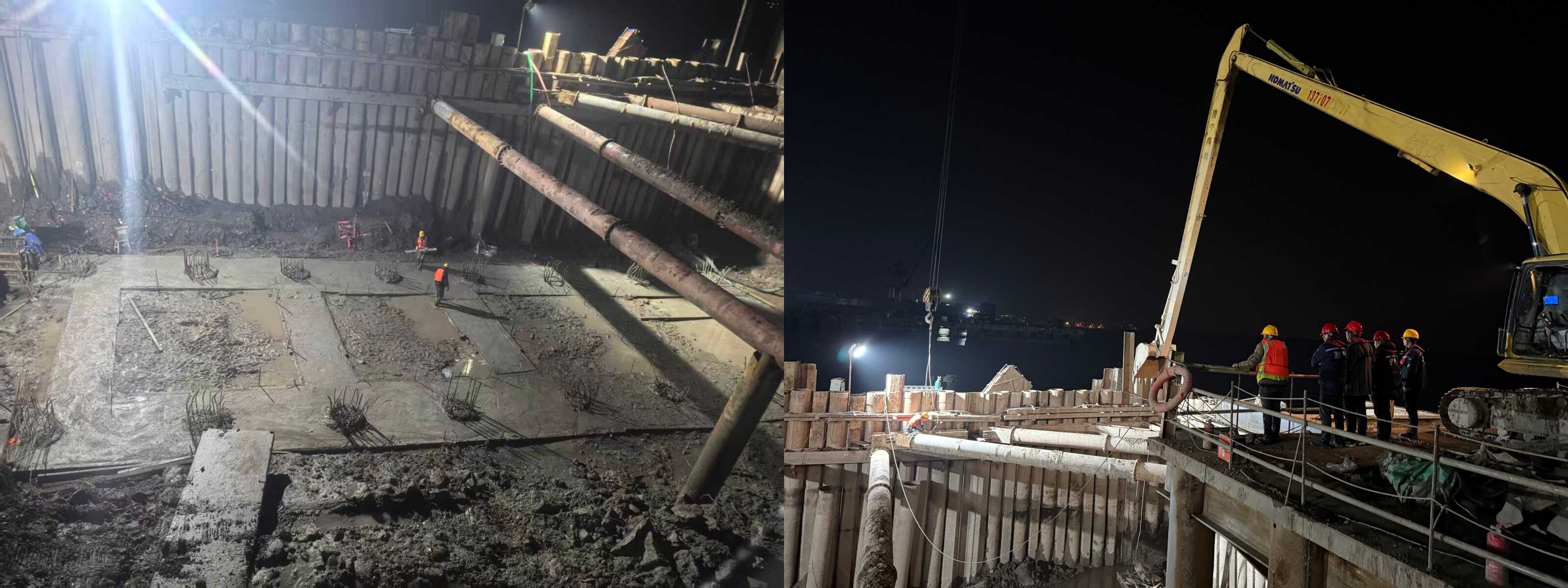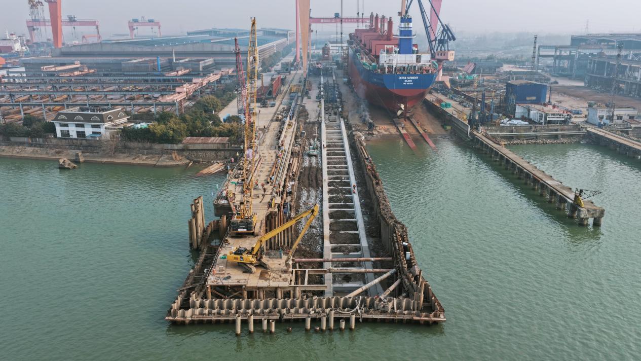 施工期间,项目面临多重挑战。地质条件的不确定性迫使项目建立动态设计机制,施工中同步开展补充地质勘探,根据新揭露的地质情况组织现场会商,第一时间履行设计变更程序;现场多工种、多设备在狭小区域内立体交叉作业,安全管控难度极大;环保管控力度大,焊接作业、泥浆处置、土方外运频频受限;临近船台船舶下水对围堰形成的不确定性影响,使现浇梁工程成为全线必须攻克的“卡脖子”环节。