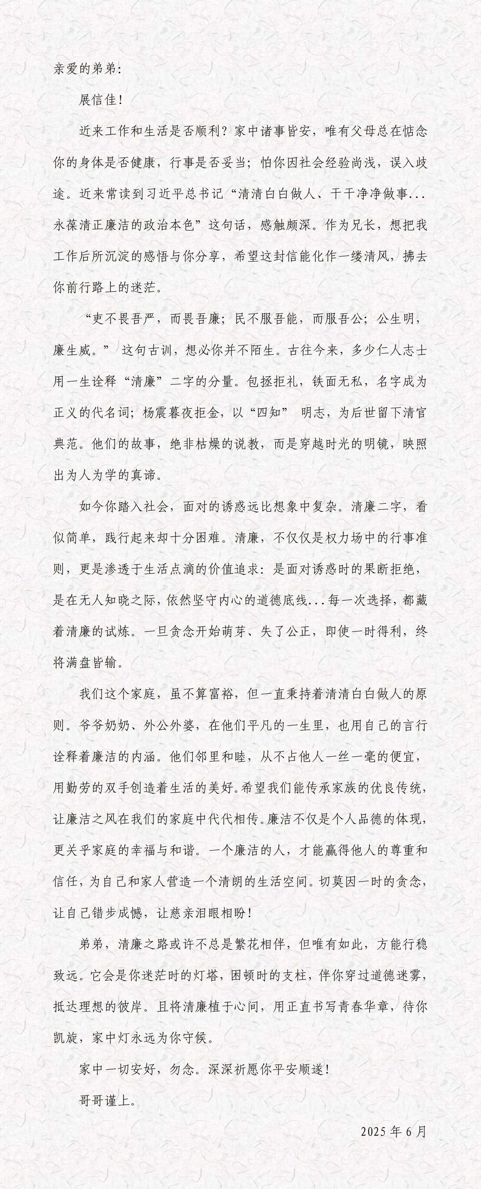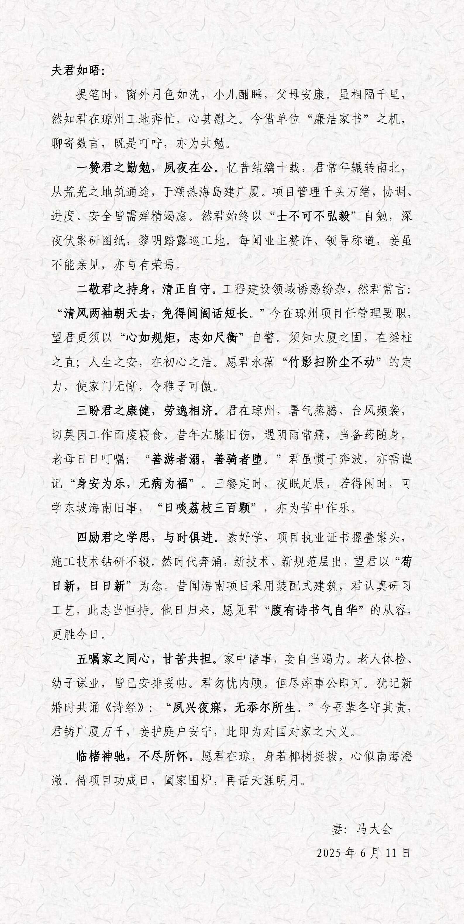 为深入学习贯彻习近平总书记关于注重家庭家教家风建设的重要论述,扎实推进总局“廉洁宣传教育月”活动走深走实,中海总局纪委组织开展“一封家书助清廉”征文活动。