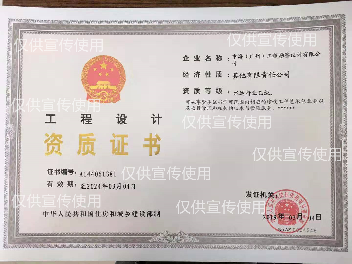 2019年3月4日,经中华人民共和国住房和城乡建设部核准,中海工程建设总局有限公司(中海总局)所属中海(广州)工程勘察设计有限公司(设计院)顺利取得水运行业乙级工程设计资质,这标志着中海总局今后可顺利开展水运工程设计与总承包业务。