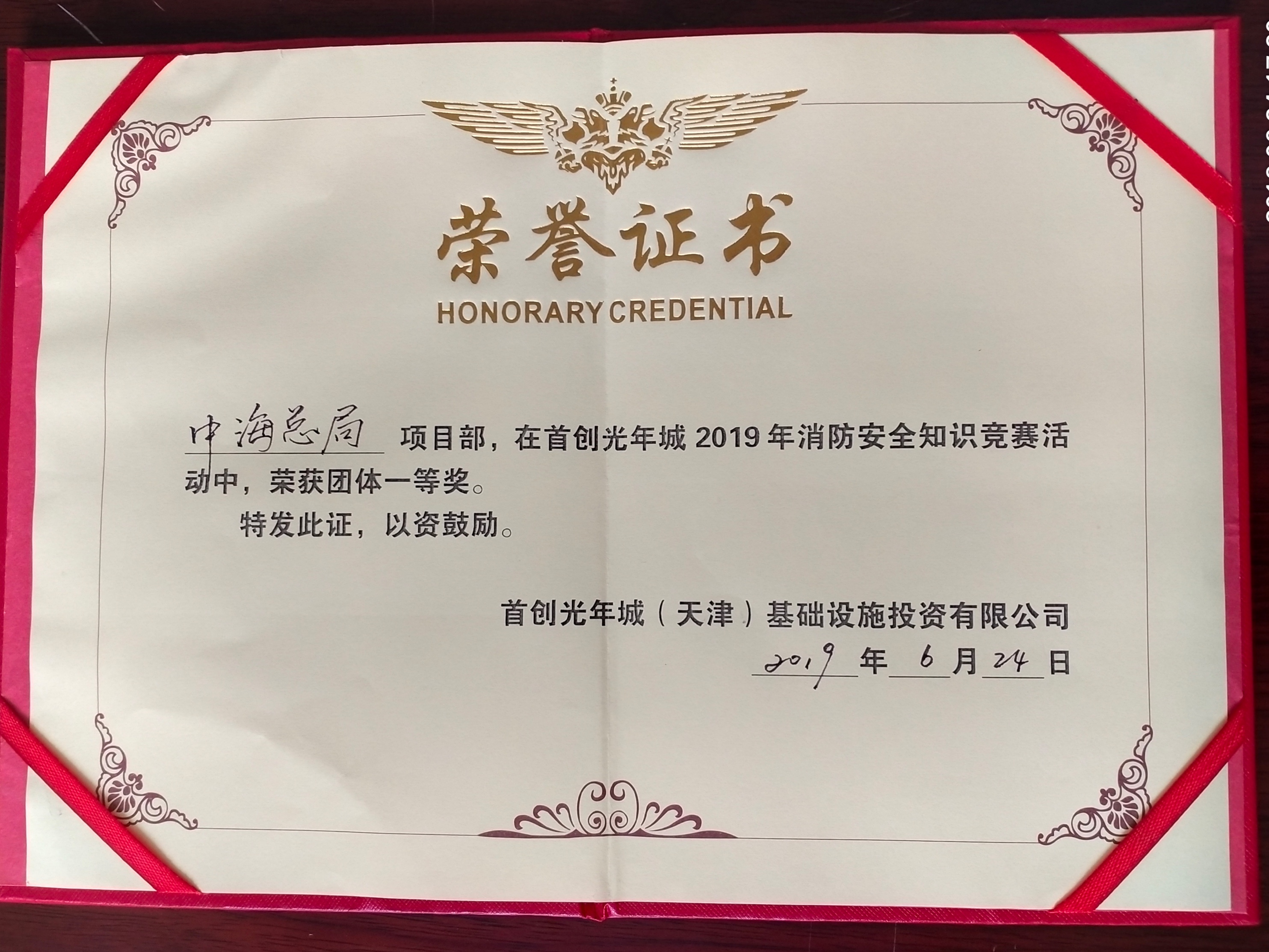 “中海工程建设总局有限公司京津合作示范区市政工程项目经理部”荣获“首创光年城2019年消防安全知识竞赛”团体一等奖