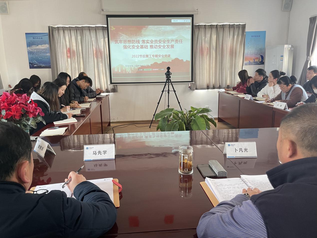 为更好地提高安全生产意识、学习安全生产知识、落实安全生产责任,2月25日下午,青岛分局党支部委托副总工程师颜景润同志为全体党员职工开展了一堂题为“筑牢思想防线 落实全员安全生产责任强化安全基础 推动安全发展”的节后复工专题安全党课。分局全体员工现场参加会议,项目管理人员视频参会。