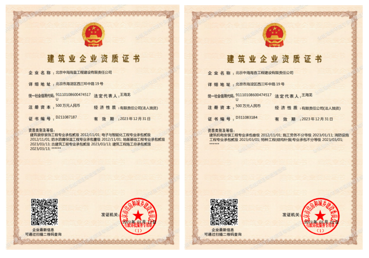 近期,北京公司资质增项获得巨大成功——新增了古建筑工程专业承包贰级、消防设施工程专业承包贰级、建筑工程施工总承包贰级、施工劳务不分等级、地基基础工程专业承包贰级、特种工程(结构补强)专业承包不分等级等六项资质。北京公司资质增项大大拓宽了其在工程业务板块规模,使相关产业链条得到了有效延伸。