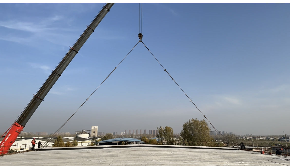 平房仓屋面采用的预应力双T板为粮库设计跨度最大尺寸(长30m*宽5m),施工过程中,项目部多次召开会议进行详细研讨和科学组织安排。从施工组织设计方案、吊装专项方案、施工安全管控及交通疏导管制到500吨吊车架设、吊装防坠施工、恶劣天气应对都进行了细致安排,最终确保了吊装安全完成,平房仓顺利封顶。