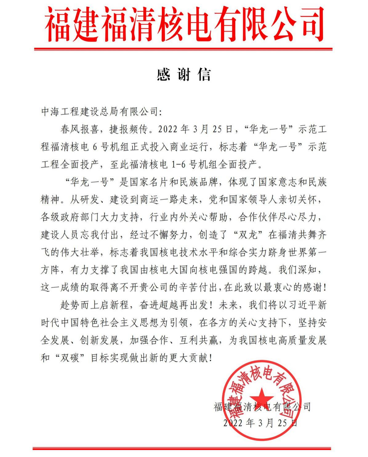 随着“华龙一号”示范工程福清核电 6 号机组正式投入商业运行,3月28日,福建福清核电有限公司向总局发来 “感谢信”,对公司及项目参建团队作出的贡献和努力表示肯定和感谢!