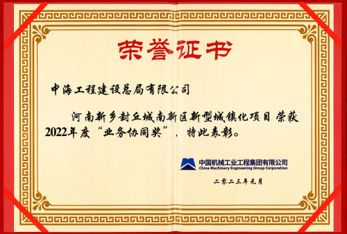 近日,在国机工程集团2022年度工作会议上,中海总局因成功参与承揽河南新乡封丘县城南新区新型城镇化项目而荣获“业务协同奖”。