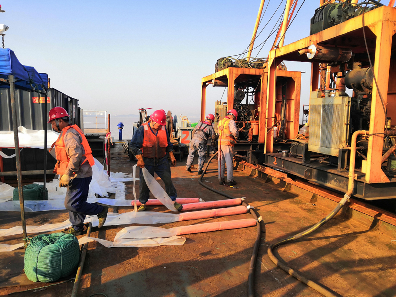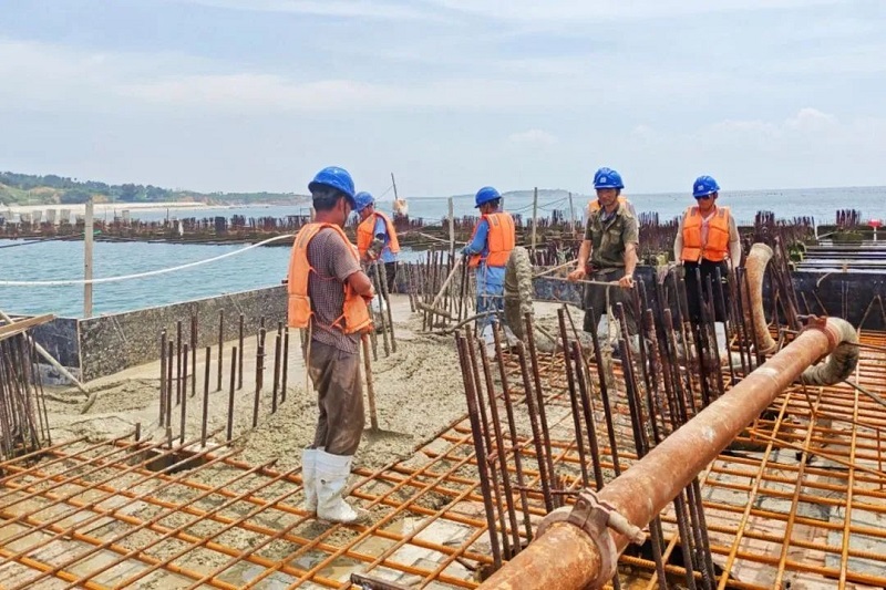 既争朝夕,又争“潮汐”,为了赶潮水保施工,确保墩台按 照计划顺利完成,大黑山岛大濠村二级渔港升级改造项目施工现 场的工人们顶着炎炎烈日浇筑混凝土。 ( 青岛分局)