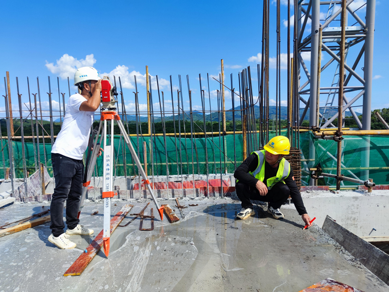 湾岭创新服务中心项目 EPC (设计、施工) 总承包项目施工 现场,现场管理人员和工人在进行测量放样。 ( 东海华庆)