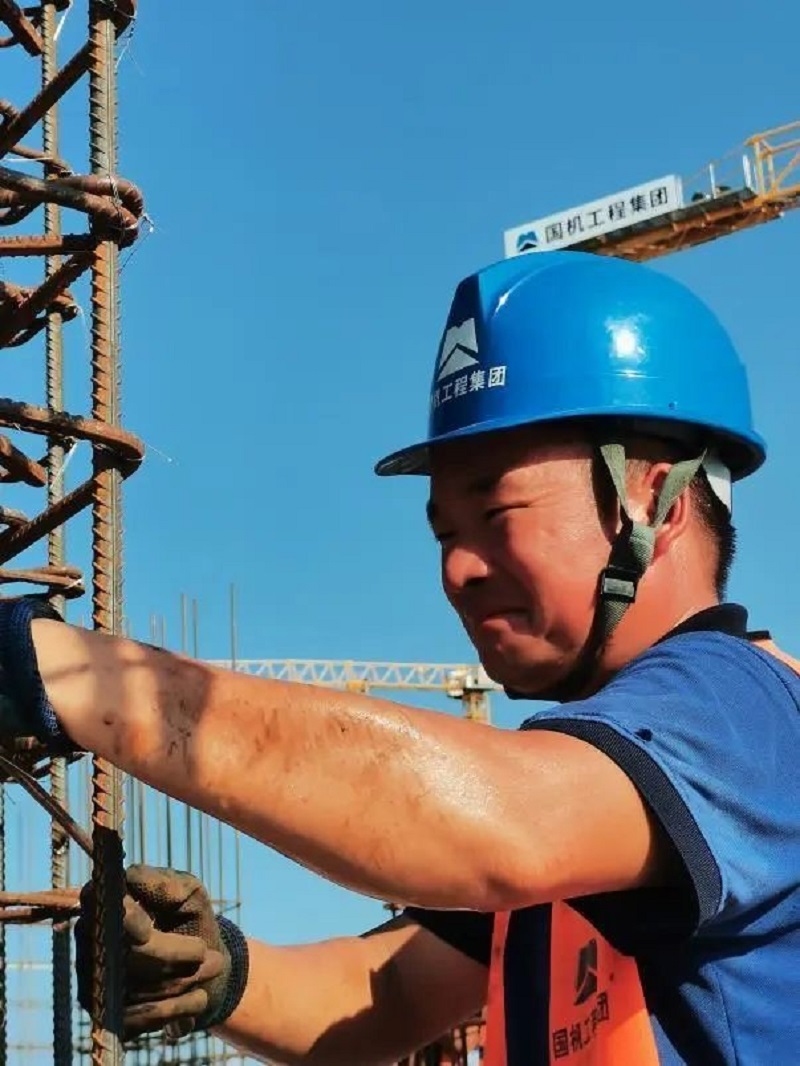 封丘县城南新区新型城镇化建设工程项目经理部采取了一 系列防暑降温措施,确保工人科学工作、安全施工。图为现场工 人正在绑扎钢筋。(封丘项目部)