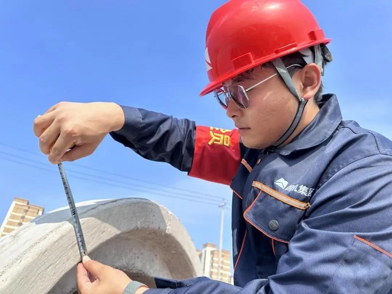 胶港大道 (扬州路-兰州东路) 及魁文路电力管廊工程设计 施工总承包项目部测量人员测量进场排水管材壁厚度,确保每一 根进场管材都在合格范围。图为项目副经理刘合清进行管材进场的质量检验工作。 ( 青岛分局)