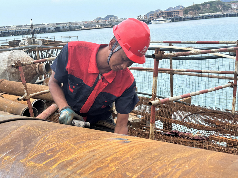 台州海洋与渔业综合执法管理服务基地项目大陈执法点码 头现场,电焊工人正在紧张有序地进行钢护筒焊接施工。( 宁波分公司)