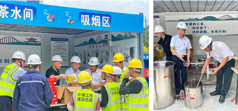 图(上)为中海总局总经理霍明明慰问文禧台项目一线职工,发放防暑 降温物资。