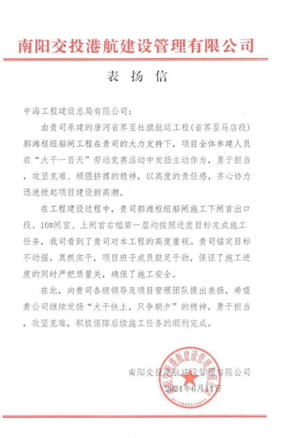 近日,由中海总局承建的河南省南阳市唐河省界至社旗航运工程(省界至马店段)郭滩枢纽船闸工程收到建设单位的表扬信,对中海总局唐河项目部在项目建设过程中主动作为、攻坚克难、敢于担当的表现给予肯定和表扬。