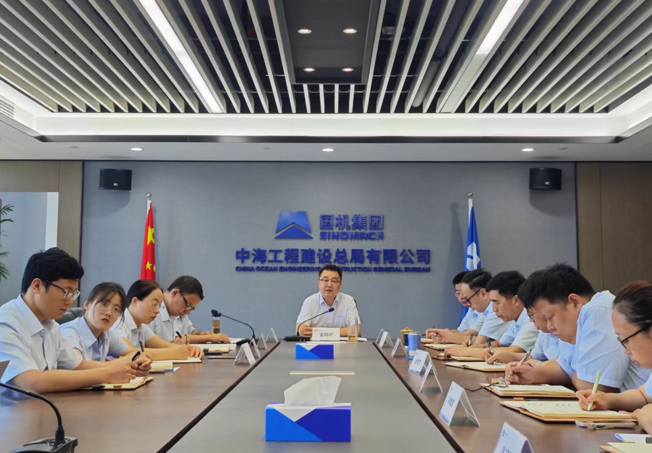 总经理助理、安全总监黄磊明主持会议。总局本级在甬领导、长三角区域中心领导班子及中层以上分管领导、检查工作组成员在主会场参加会议。各分支机构主要负责人,工程、商务、财务方面分管领导及相关人员以分会场形式视频参与会议。