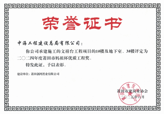 近日,从莆田市建筑业协会传来喜讯,由中海总局承建的文禧台项目总承包工程,荣获2024年度莆田市“妈祖杯”优质工程奖。这一殊荣标志着项目在施工安全、质量管控及文明施工等方面得到了评审专家的一致认可。