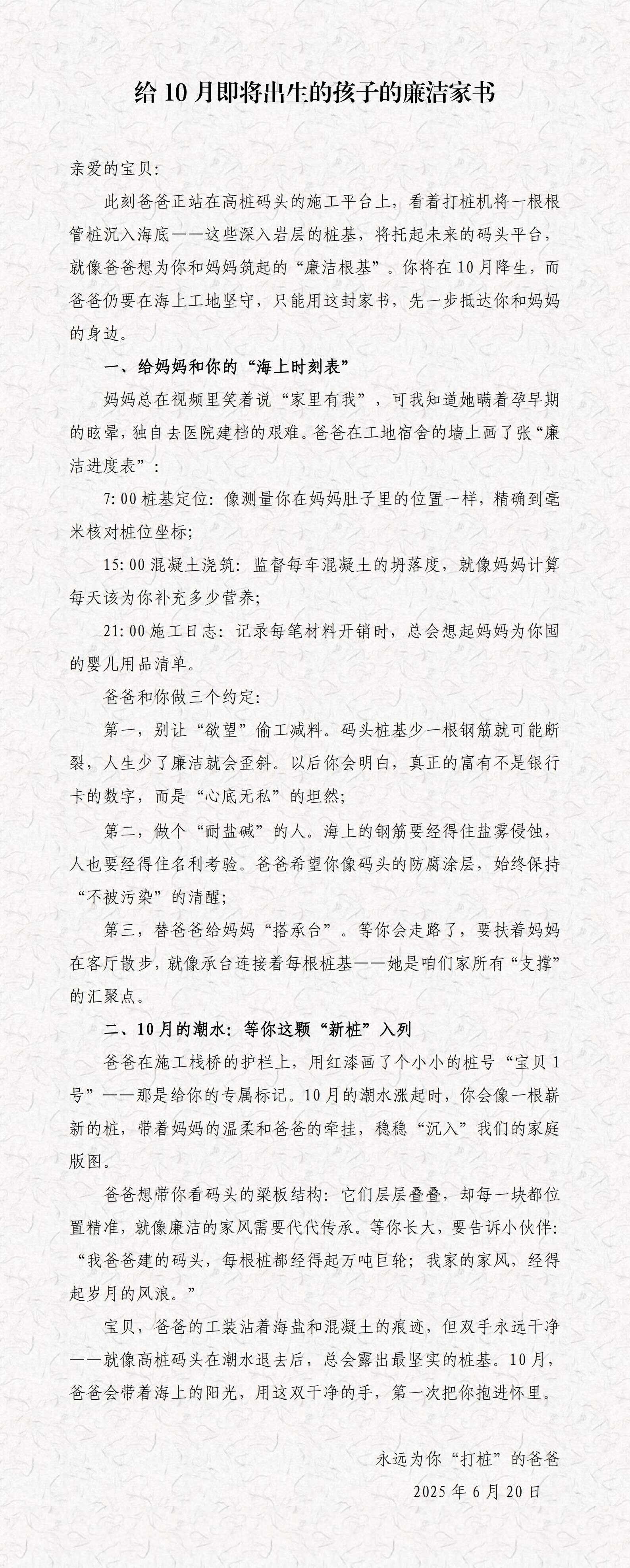 为深入学习贯彻习近平总书记关于注重家庭家教家风建设的重要论述,扎实推进总局“廉洁宣传教育月”活动走深走实,中海总局纪委组织开展“一封家书助清廉”征文活动。