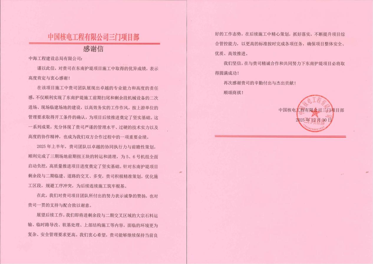 近日,中国核电工程有限公司三门核电项目部向中海总局发出“感谢信”,对中海总局及项目参建团队在三门核电东南护堤工程建设中的卓越贡献表示高度认可与诚挚感谢。